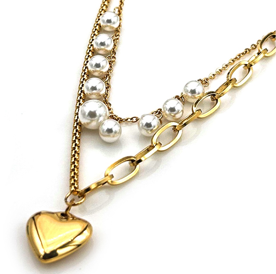 B-D11.1 N1131-003G S. Steel Necklace Layered Heart - Pearls