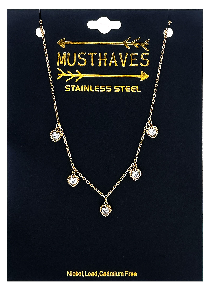 Introducing the C-D4.3 N1131-004G Stainless Steel Necklace, a stunning piece that beautifully combines elegance and modern design. This exquisite necklace features a delicate arrangement of heart-shaped pendants, each adorned with sparkling crystals that catch the light with every movement.