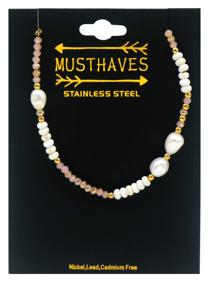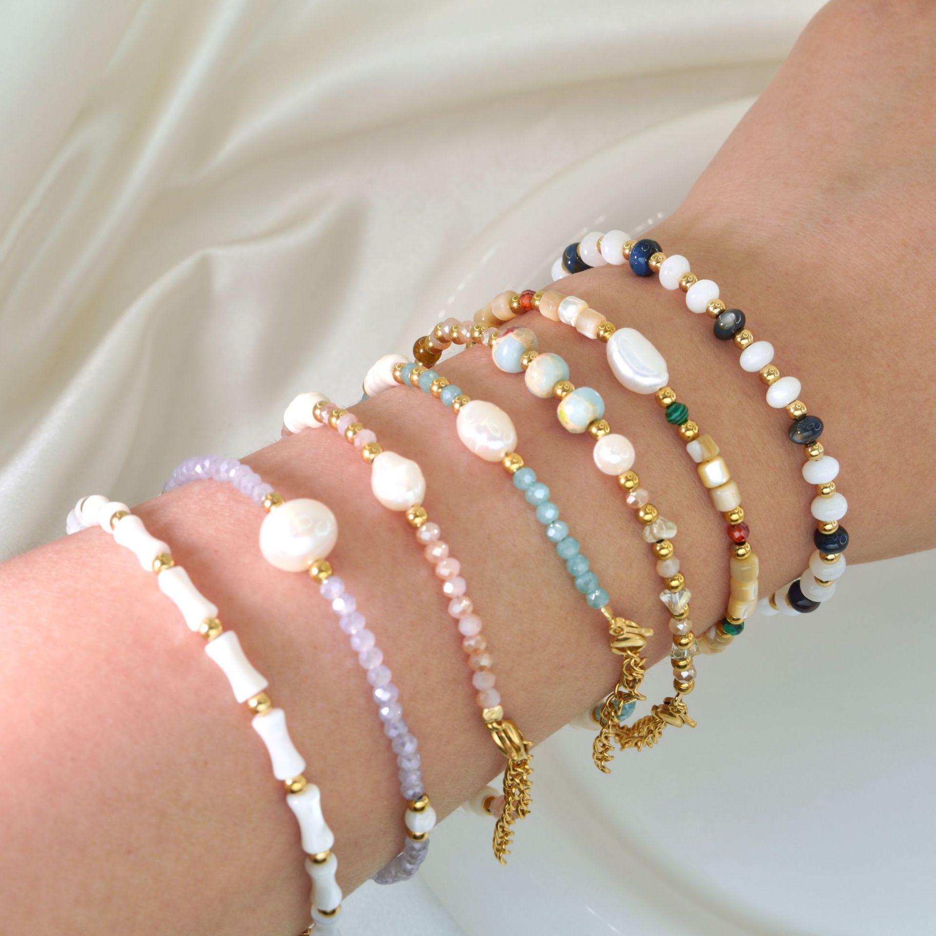 Introducing the E-C7.2 B2583-025G Stainless Steel Bracelet with Glass Beads and Pearls, a stunning accessory that effortlessly combines elegance and contemporary style. This exquisite bracelet features a harmonious blend of lustrous glass beads and genuine pearls, creating a captivating visual appeal that is perfect for any occasion.