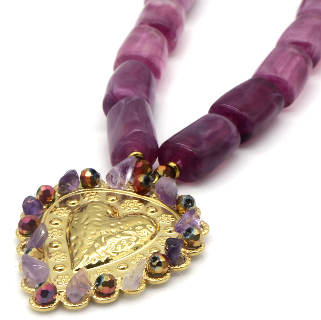 Adorned with vibrant purple acrylic beads, this necklace adds a pop of colour to any outfit, making it the perfect statement piece for both casual and formal occasions. The adjustable length of 40-45cm allows for a comfortable fit, ensuring it sits perfectly around your neckline.