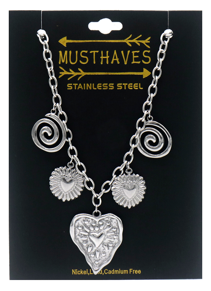 Introducing the H-E14.2 N1160-001S Stainless Steel Necklace, a stunning piece designed to elevate your accessory collection. This exquisite necklace features a unique combination of hearts and swirls, beautifully crafted in high-quality silver-toned stainless steel. With an adjustable length of 40-45cm, it offers versatility to suit any neckline or outfit.